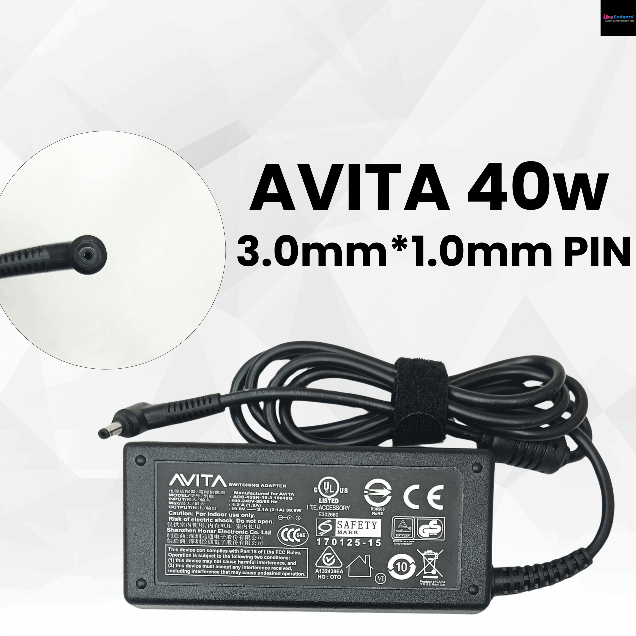 This Adapter Comes With 40W 19V charger with a 3.0mm x 1.0mm regular pin, designed for Avita laptops.