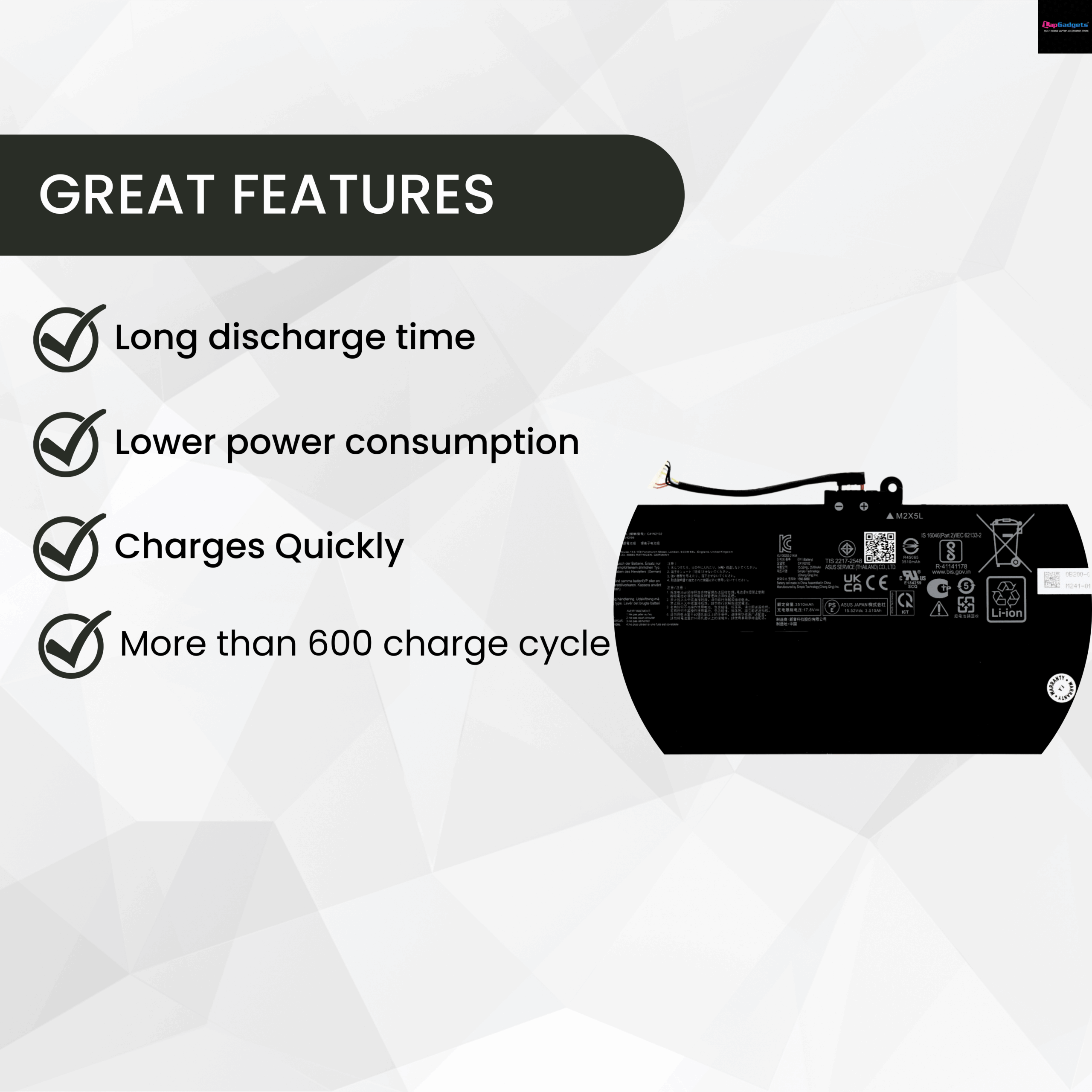 Certified Safety Standards: BIS Certififed, Built-in overcharge, overheating, and short-circuit protection.