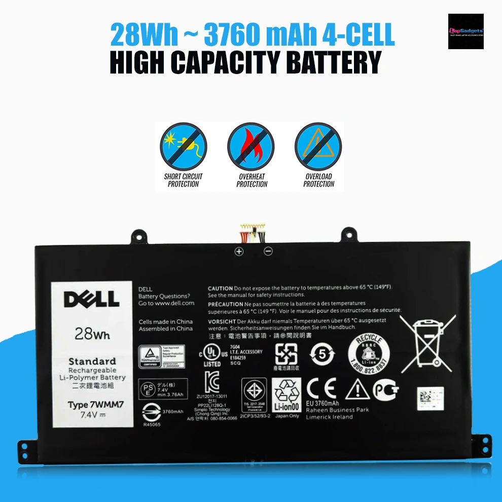 Upgrade your laptop’s performance with Dell 7wmm7 Original Laptop Battery. It boasts a capacity of 28Wh (3760mAh), offering extended runtime for everyday tasks like web browsing, document editing, and multimedia playback. which is compatible with Cfc6c, Cp305193l1, D1r74, Rty89 and Dl011301-plp22g01 models.