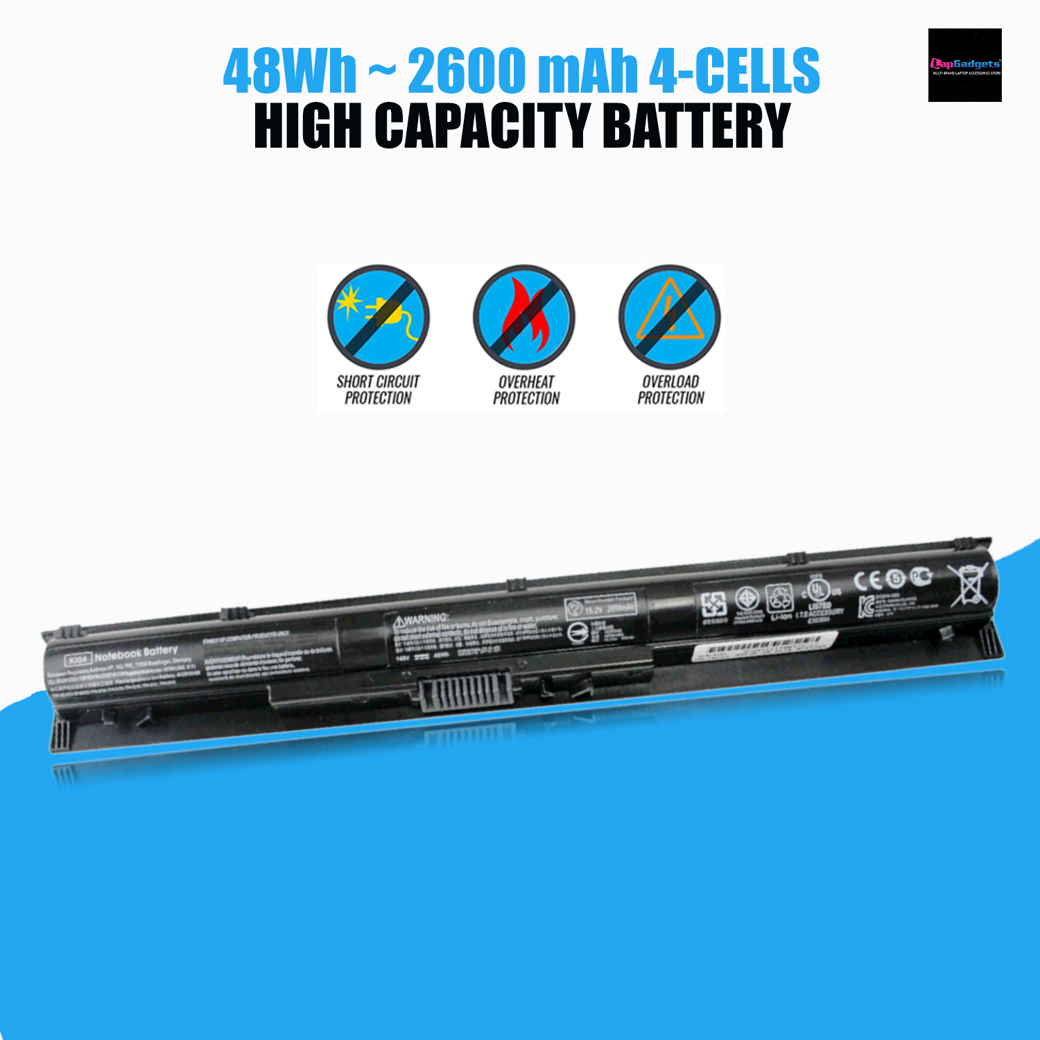this replacement battery for HP KI04 laptop can be charged/discharged for more than 500-750 cycles (has been rigorously tested). Every piece of replacement HP KI04 battery pack is under the united protection of the PCP board, PCM board and intellectual power measurement circuit: automatically adjusting the charging time to achieve the maximum amount of charge, with over-charge protection, over-discharge protection, over current protection and short circuit protection.