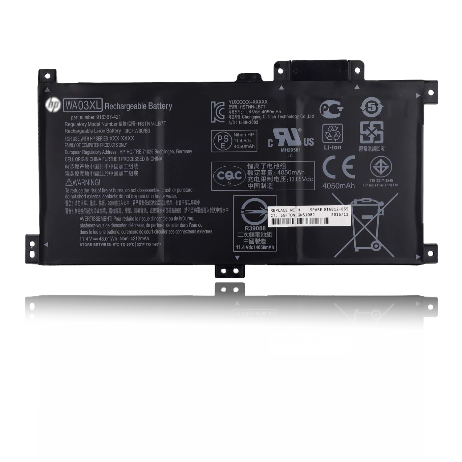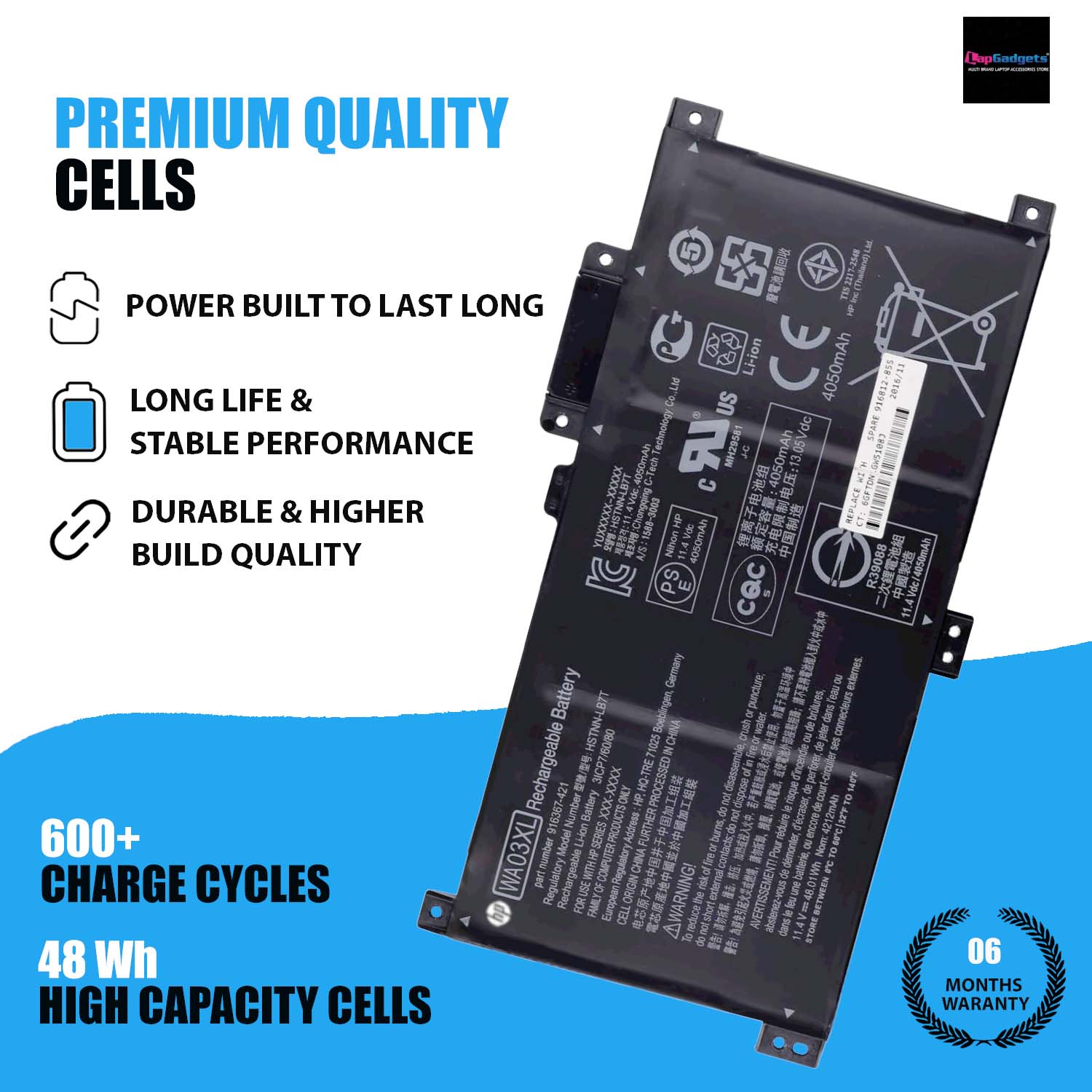 This high quality rechargeable HP WA03XL Battery is designed with the highest control standards; have internal circuit boards with smart chips ( Cell imbalance shut off protection, Thermal runaway protection, Overcharge shut off protection, Over discharge shut off protection, High/low temperature shut off protection ), and are made from eco-friendly materials without lead or mercury. Every HP laptop battery has been Certified by CE, UL, ROHS, ISO9001/9002 and has passed strict safety tests. Long lasting, this extended 6 cells HP WA03XL battery can be charged/discharged for more than 600-800 cycles.