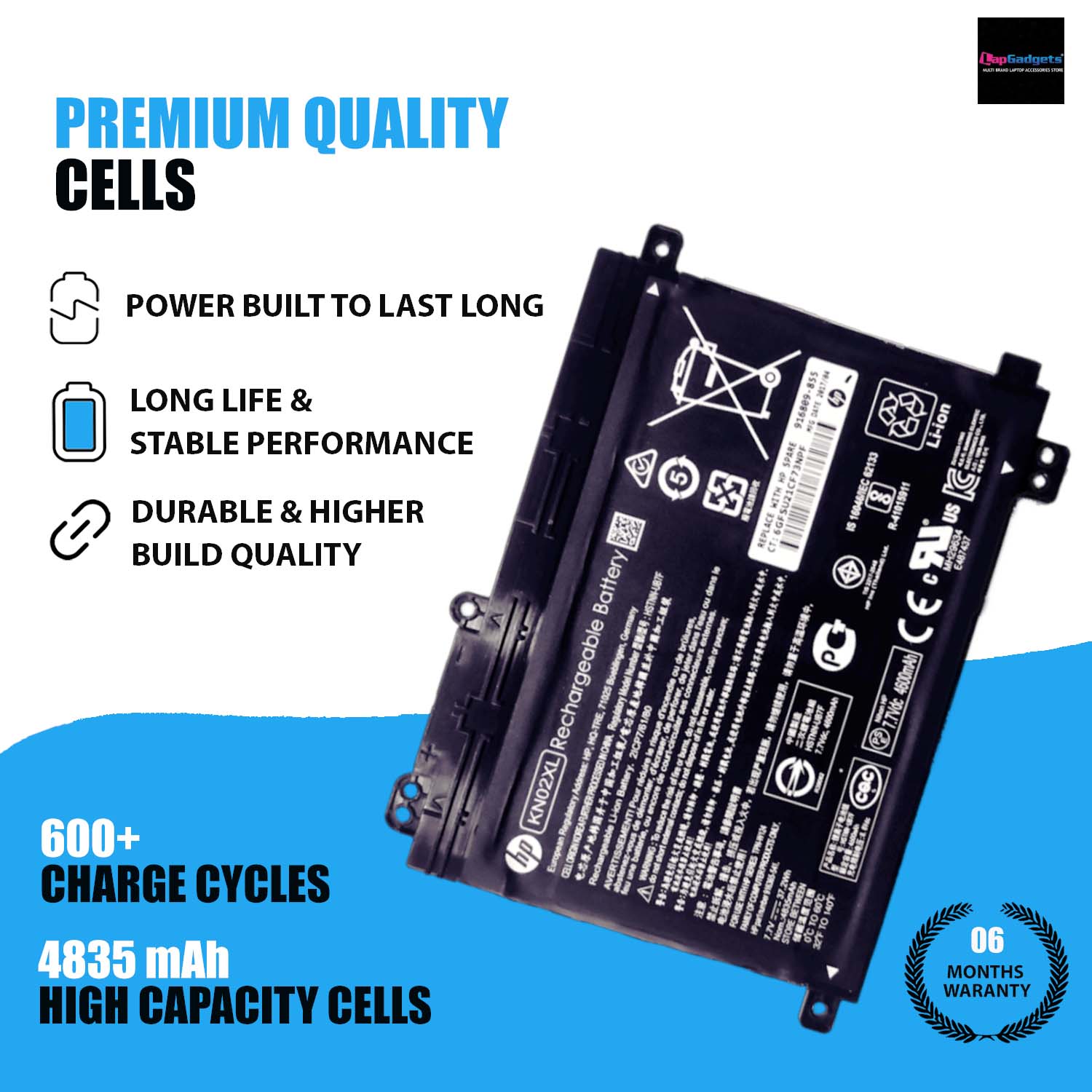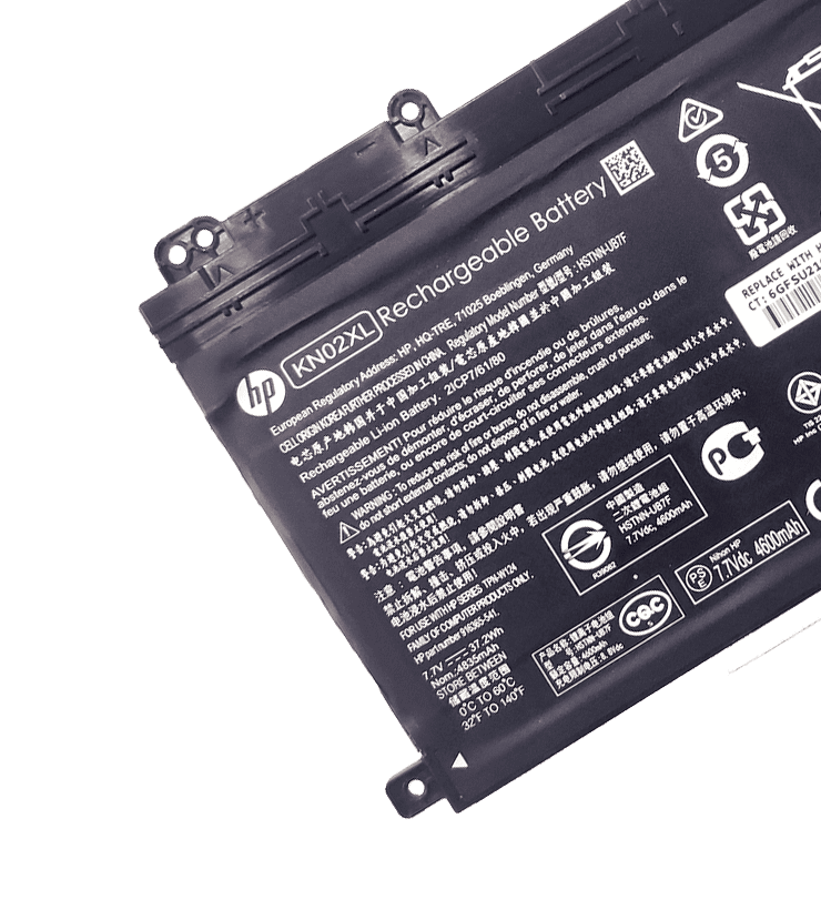 This high quality rechargeable battery for HP KN02XL laptop is designed with the highest control standards; have internal circuit boards with smart chips ( Cell imbalance shut off protection, Thermal runaway protection, Overcharge shut off protection, Over discharge shut off protection, High/low temperature shut off protection ), and are made from eco-friendly materials without lead or mercury. Every replacement HP laptop batterry has been Certified by CE, UL, ROHS, ISO9001/9002 and has passed strict safety tests. Long lasting, this extended 4 cells HP KN02XL battery can be charged/discharged for more than 600-800 cycles.