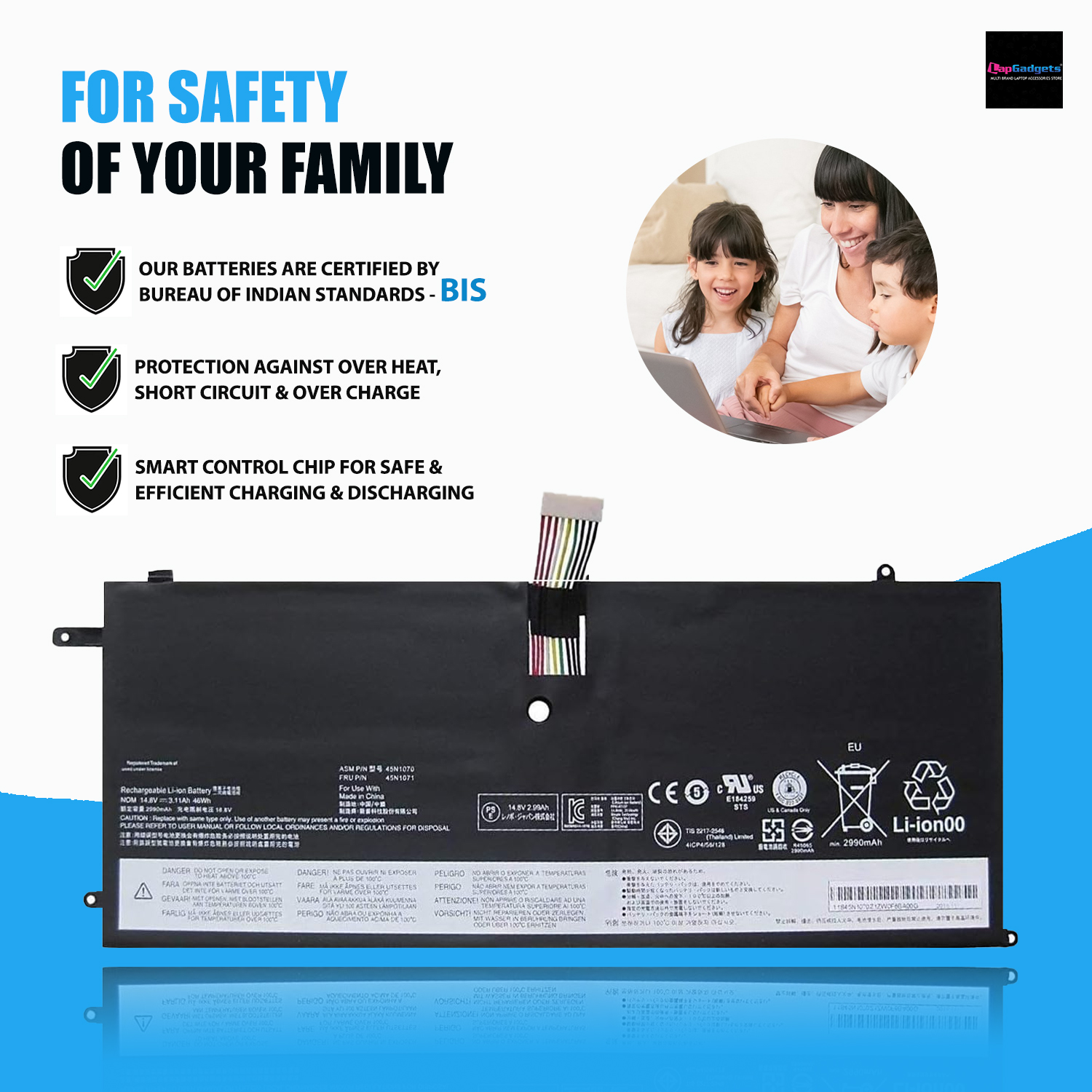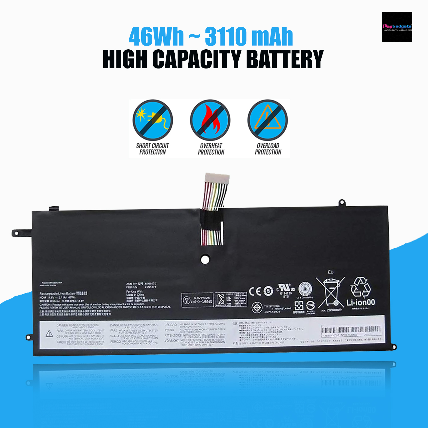 This brand new 14.8V 2200mAh(4 cells) replacement Lenovo 45N1070 Battery is made with high-grade Li-ion-Polymer cells from Samsung, LG, Panasonic to ensure maximum performance. This replacement Lenovo 45N1070 Battery battery pack is specially designed with multiple-protection circuit for maximum safety. The housing of the Lenovo 45N1070 Battery pack is made of non flammable and very durable plastic, which is fire retarded and avoids damage when dropped from low heights.