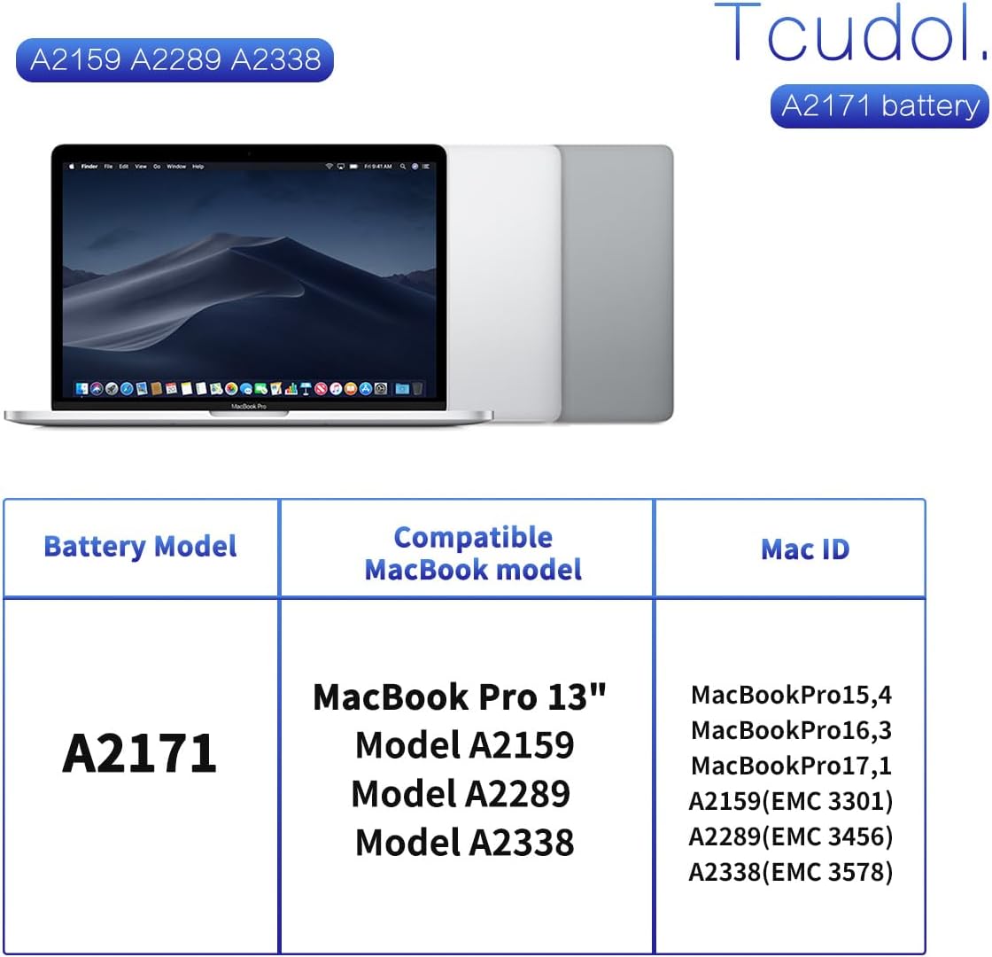 | Compatible Model: No selection | 2019 Touch MacBook Pro 13-inch MUHN2LL/A, NEW OEM Genuine 58.2Wh Battery A2171 Mid 2019 A215 |