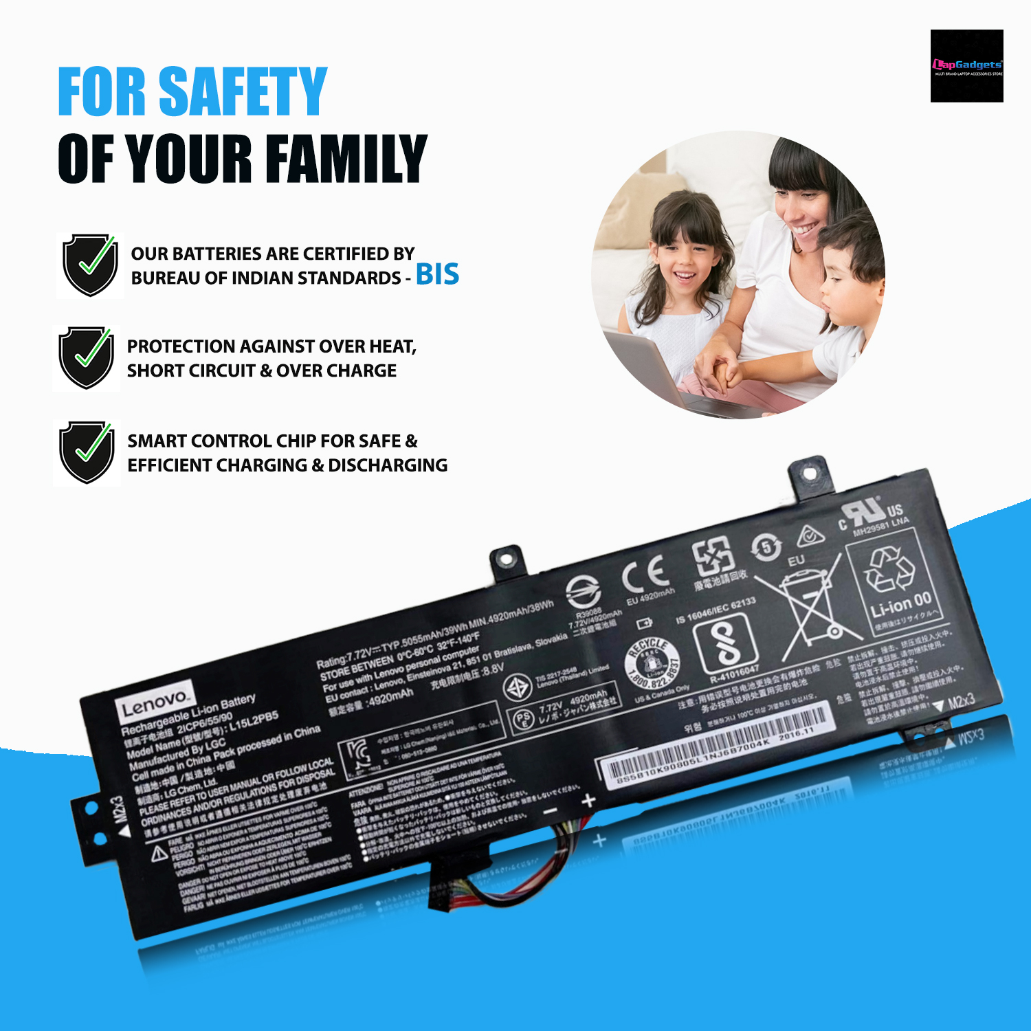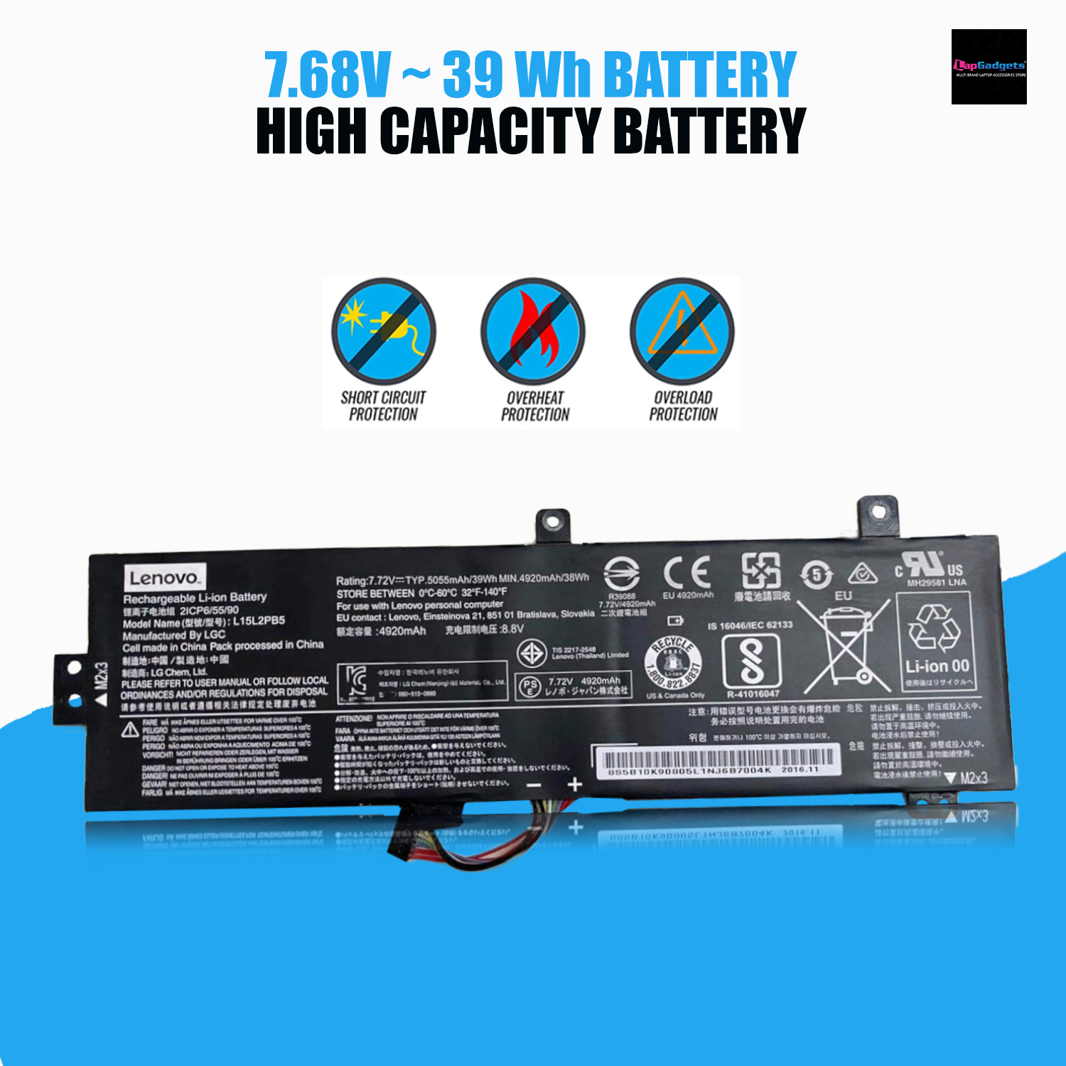 This high quality rechargeable Lenovo L15L2PB4 L15C2PB4 L15M2PB4 is designed with the highest control standards; have internal circuit boards with smart chips ( Cell imbalance shut off protection, Thermal runaway protection, Overcharge shut off protection, Over discharge shut off protection, High/low temperature shut off protection ), and are made from eco-friendly materials without lead or mercury. Every replacement Lenovo laptop batterry has been Certified by CE, UL, ROHS, ISO9001/9002 and has passed strict safety tests. Long lasting, this extended Lenovo L15L2PB4 L15C2PB4 L15M2PB4 battery can be charged/discharged for more than 500-700 cycles.