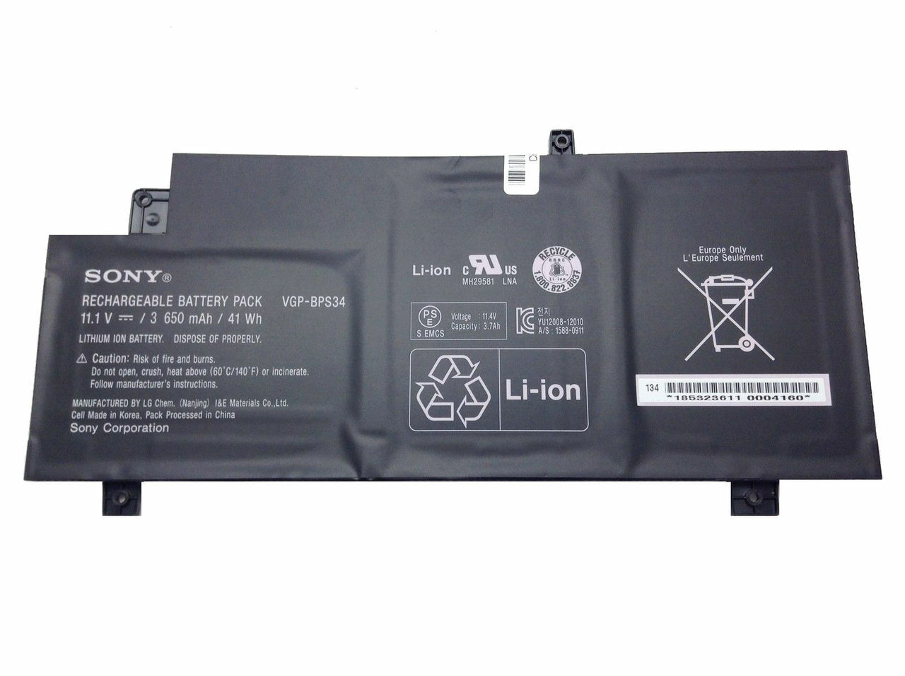 This high quality rechargeable Sony VGP-BPS34 Battery is designed with the highest control standards; have internal circuit boards with smart chips ( Cell imbalance shut off protection, Thermal runaway protection, Overcharge shut off protection, Over discharge shut off protection, High/low temperature shut off protection ), and are made from eco-friendly materials without lead or mercury. Every replacement Sony laptop battery has been Certified by CE, UL, ROHS, ISO9001/9002 and has passed strict safety tests. Long lasting, this extended Sony VGP-BPS34 battery can be charged/discharged for more than 500-700 cycles.